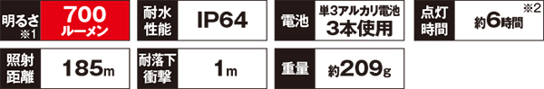 ■点灯時間(約):【ヘッド部】6時間(Highモード)/ 10時間(Midモード)/ 25時間(Ecoモード)、【後部認識灯】90時間(点灯)/ 130時間(点滅)